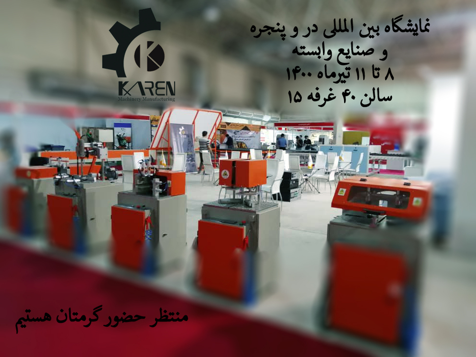 کارن ماشین با 13 سال سابقه در طراحی و ساخت انواع ماشین آلات مونتاژ درب و پنجره upvc شما را به بازدید از غرفه این شرکت در سیزدهمین نمایشگاه درب و پنجره و صنایع وابسته مورخه 8 تا 11 تیر ماه 1400 در محل دائمی نمایشگاههای بین المللی تهران سالن 40 غرفه 15 دعوت می نماید.